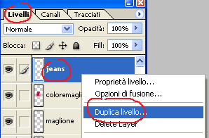 5) PASSO N° 5: adesso, duplichiamo il livello jeans. Posizioniamoci con il tasto destro del mouse sul livello JEANS e clicchiamo. Del nuovo sotto menù che si aprirà selezioniamo e clicchiamo su DUPLICA LIVELLO come in immagine: